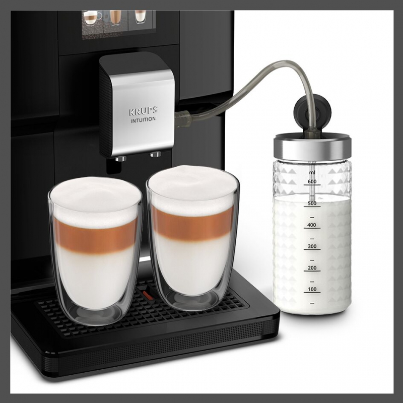 Součástí kávovaru je hadička, která slouží na přípravu bohaté mléčné pěny. Jeden konec vložíte do hlavy kávovaru, druhý zastrčíte do karafy s mlékem nebo přímo do krabice. Tím odpadá nutnost přelévat mléko do nádob, které byste poté museli rozebrat a vyčistit. Po použití hadičku pouze opláchnete pod tekoucí vodou, čištění mléčného okruhu v kávovaru probíhá automaticky. Tento model obsahuje navíc 600ml nádobu na mléko.