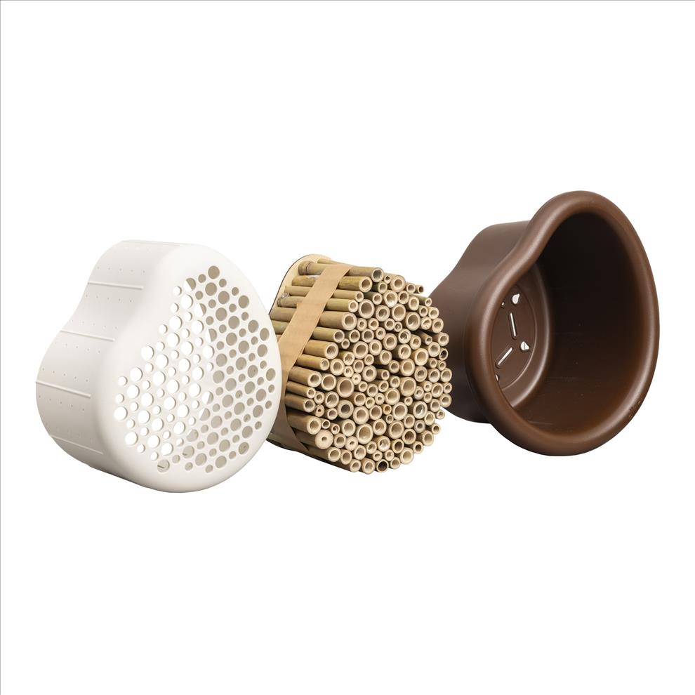 Vytvořte útulné místo pro nejdůležitější návštěvníky vaší zahrady nebo balkonu: včely. Inspirováno přírodou, tento hmyzí hotel nabízí užitečným opylovačům bezpečné místo k odpočinku, daleko od predátorů. Je vyroben ze 100 % recyklovaného plastu a je jednoduchý na montáž na zeď, strom nebo plot.