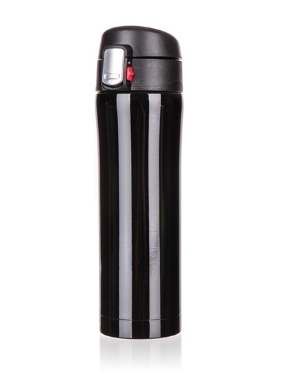 Termoska BODO 430 ml černý; Cestovní termoska BODO o objemu 430 ml má vnější i vnitřní povrch z nerezi a plastové vyklápěcí víčko. Díky dvoustěnnému provedení si udrží nápoj déle svou teplotu. Víčko se otevírá stisknutím pojistky, u které je zámek zabraňující nechtěnému otevření termosky.