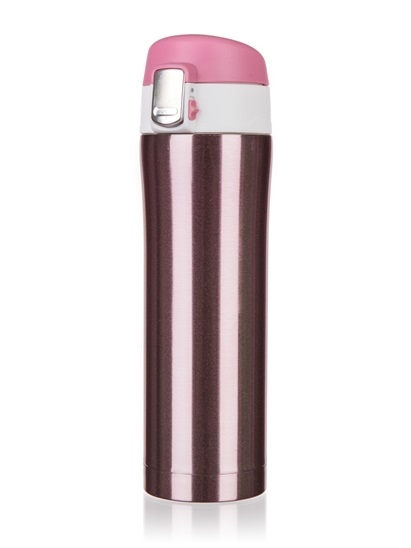 Termoska BODO 430ml růž.met.; Cestovní termoska BODO o objemu 430 ml má vnější i vnitřní povrch z nerezi a plastové vyklápěcí víčko. Díky dvoustěnnému provedení si udrží nápoj déle svou teplotu. Víčko se otevírá stisknutím pojistky, u které je zámek zabraňující nechtěnému otevření termosky.