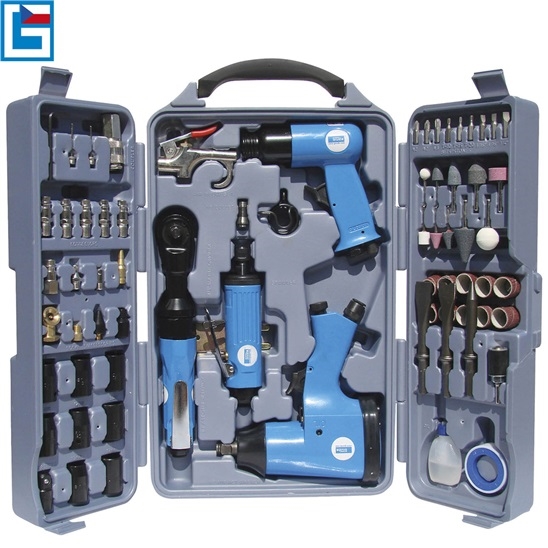 71-dílná sada pneumatického nářadí s příslušenstvím, pokrývající základní vybavení dílny, provozované na stlačený vzduch.Složení sady: příklepový utahovák 1/2'', ráčnový utahovák 1/2'', sekací kladivo, stopková bruska, pneu pistole MINI.Příslušenství: sada nástrčných klíčů (8), adaptér 3/8''-1/2'', bitový adaptér 3/8'', sada bitů (9), sada sekáčů (3, včetně přídržné pružiny),sada brusných kolíků (10), sada pneu adaptérů a trysek, teflonová páska, vsuvky 1/4'' (5), transportní plastový kufřík(- uzpůsoben pro montáž na stěnu dílny).