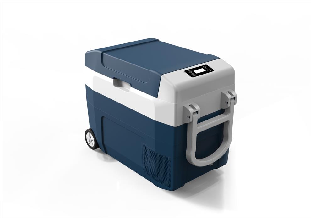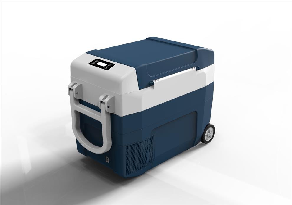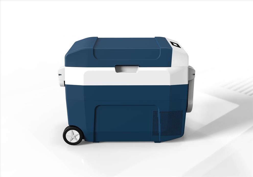 Chladící box rodinné velikosti vybavený kolečky a madlem