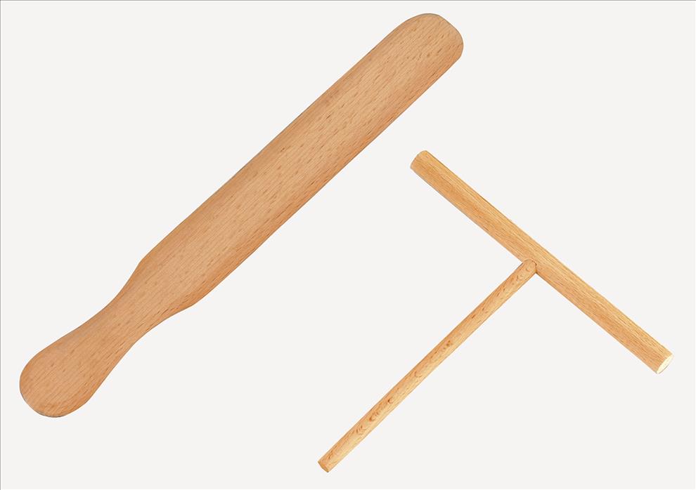 Příslušenství z bukového dřeva: stěrka k roztírání těsta ve tvaru T a špachtle