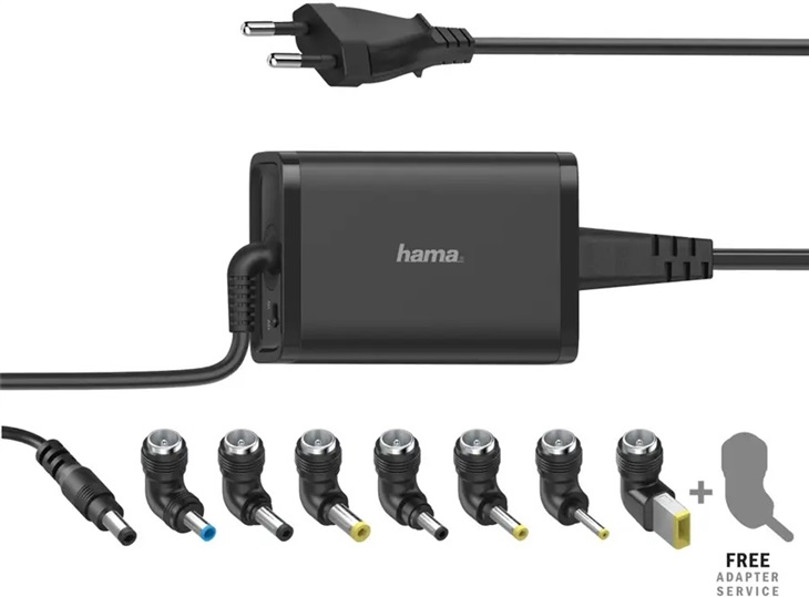 univerzální notebookový zdroj, 8 různých konektorů, max. výstupní výkon 65 W, max. výstupní proud 4,25 A, vstupní napětí 110 až 240 V, ochrana proti zkratu, přehřátí a přetížení, rozměry 8 x 5,5 x 3,1 cm, hmotnost 308 g