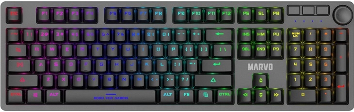 herní klávesnice; 107 kláves(3 k ovládání médií+kolečko k regulaci hlasitosti); mechanická(modré spínače Jixian blue); životnost:50mil.stisknutí; podsvícení rainbow(21módů); antighosting pro všechny klávesy; odnímatelný USB-C kabel;bezrámový design;přes software lze klávesnici libovolně přizpůsobit