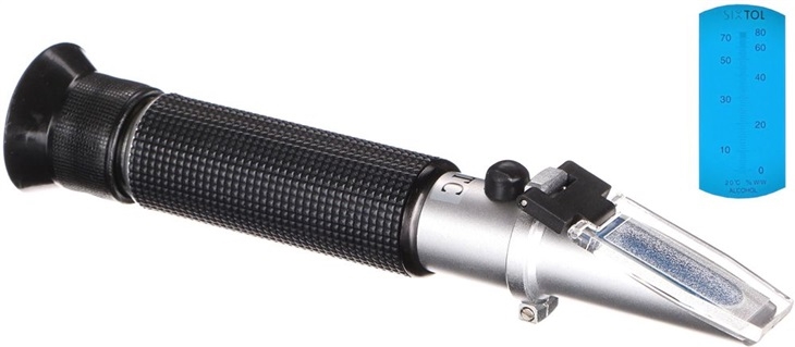Ruční refraktometr určený k měření objemových procent alkoholu.