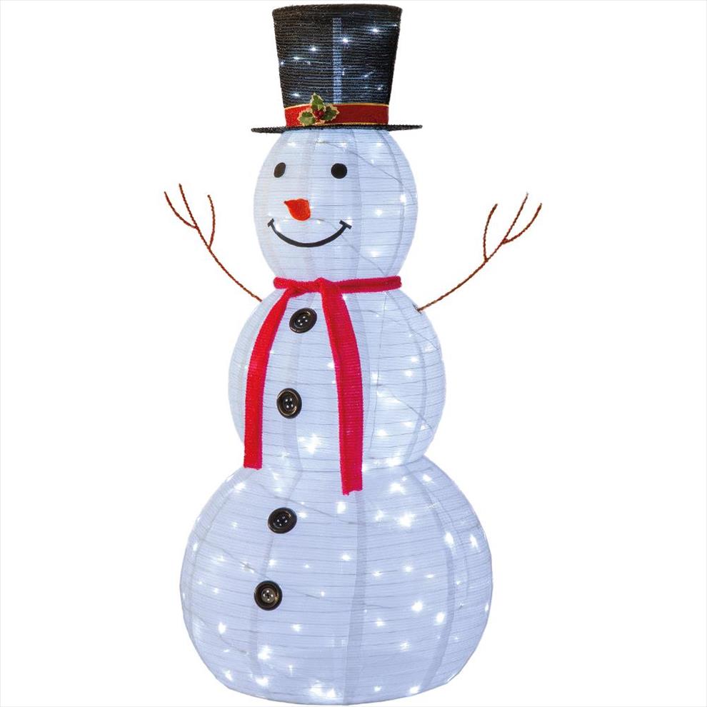 Vánoční sněhulák 160 LED. Dělka přívodní šňůry 5 m. Počet LED 160. Výška 180 cm. Barva světla: studená bílá. 10% LED diod problikává. Pro venkovní i vnitřní použití. Krytí IP44