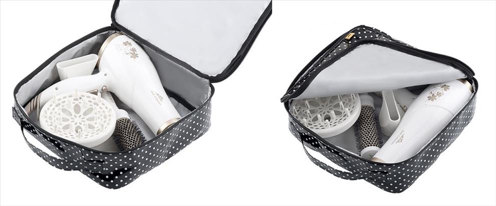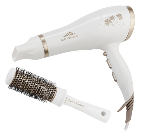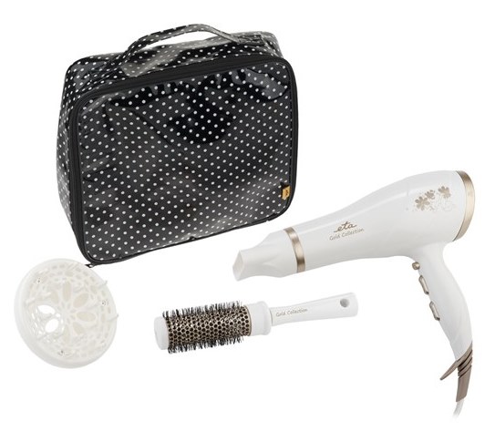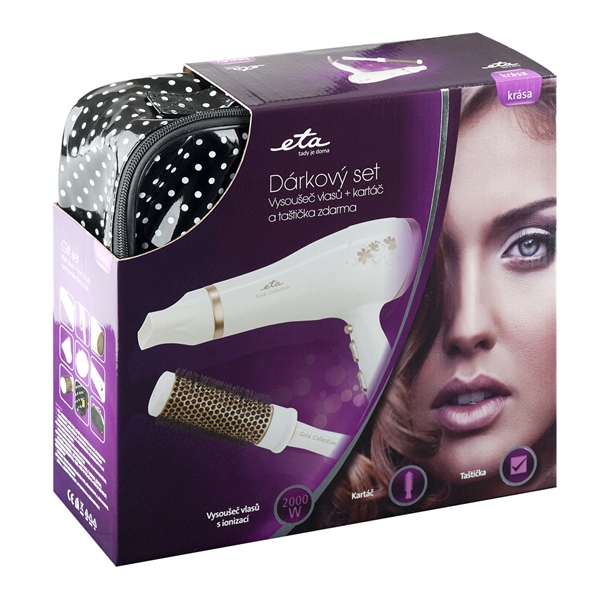 V dárkové sadě ETA získáte praktické pomocníky nebo ji můžete věnovat jako dárek. Kromě fénu potěší kartáč na vlasy s pružnými hroty a také dárková taštička. Tu lze využívat pro přenos fénu nebo jako klasickou kosmetickou taštičku.