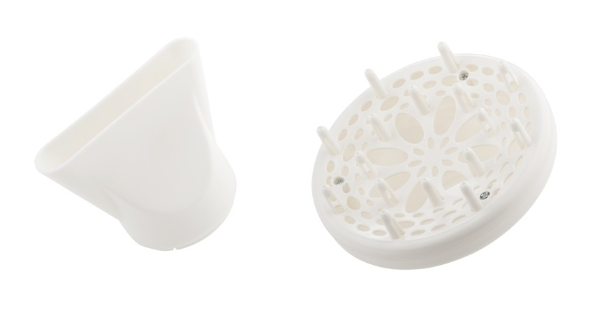 Podle potřeby můžete volit mezi dvěma nástavci – koncentrátor otočný o 360° nebo difuzér. Při používání fénu potěší ergonomicky tvarovaná rukojeť a poutko na zavěšení.