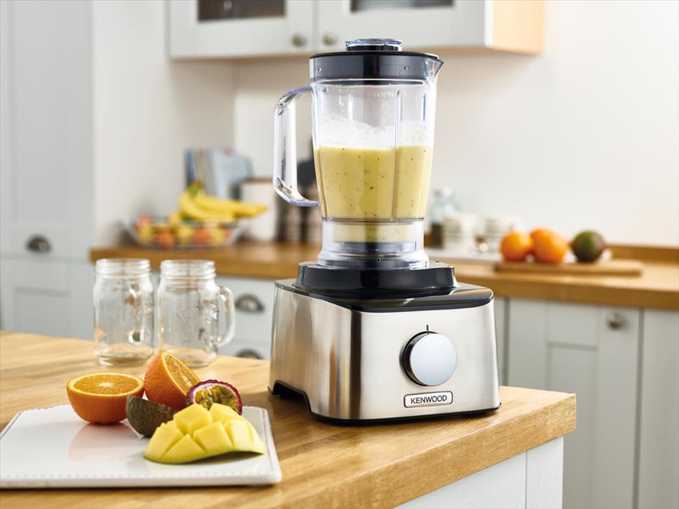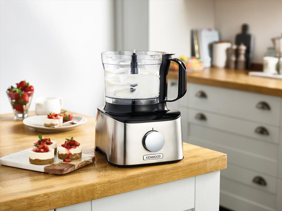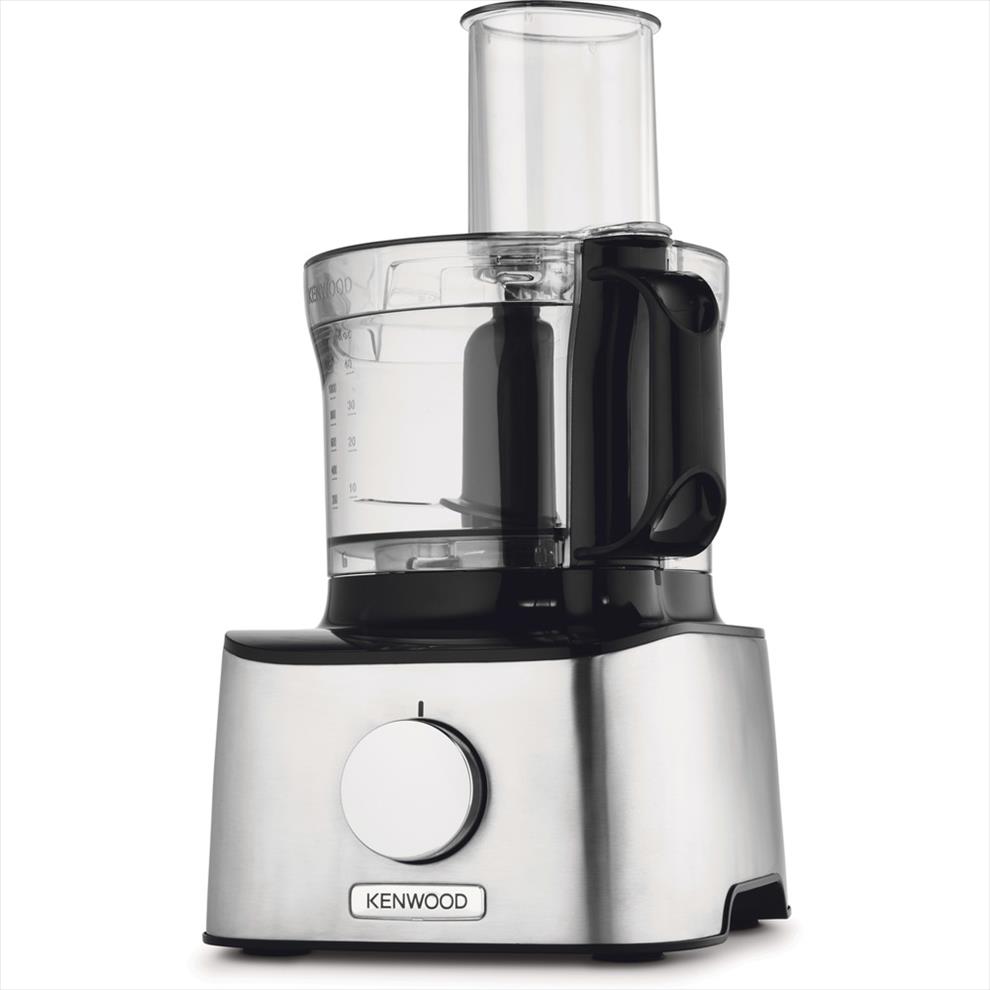 Multifunkční kuchyňský robot KENWOOD FDM301SS Food processor Multipro Compact s kovovou základnou a výkonem 800 W. Je vybaven specifickými funkcemi - mixování, šlehání, hnětení, strouhání i odšťavňování.
