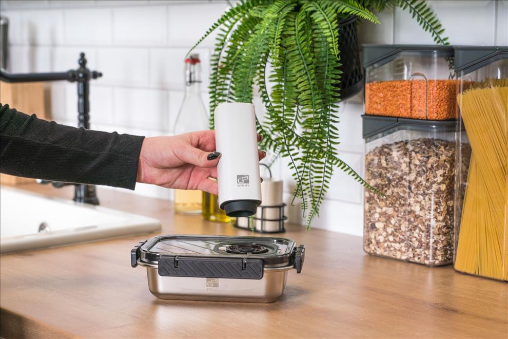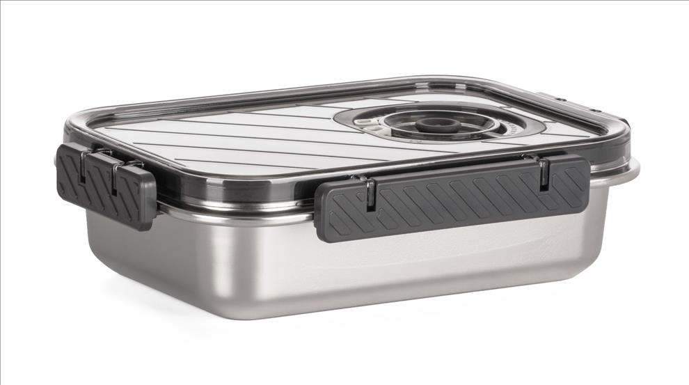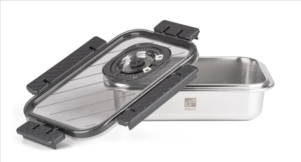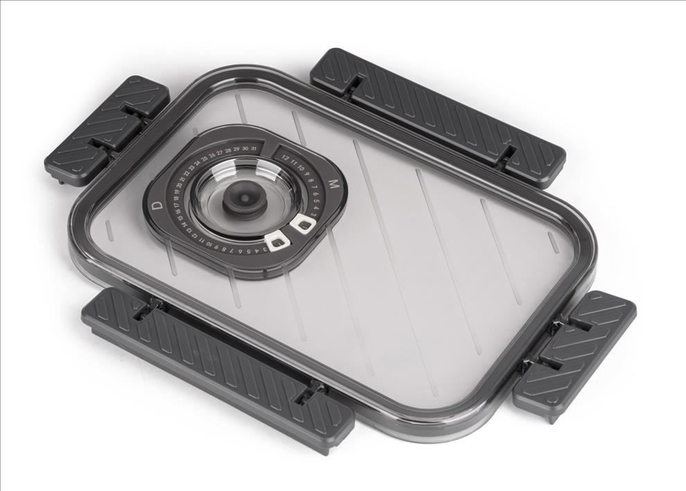 Víko z BPA Free plastu je vybavené vakuovacím ventilem a praktickým nastavitelným ukazatelem data. Budete tak vědět, kdy byly potraviny vakuovány nebo do kdy se mají spotřebovat. Pro uvolnění vakua a otevření dózy stačí jemně zmáčknout ventil uprostřed víka.