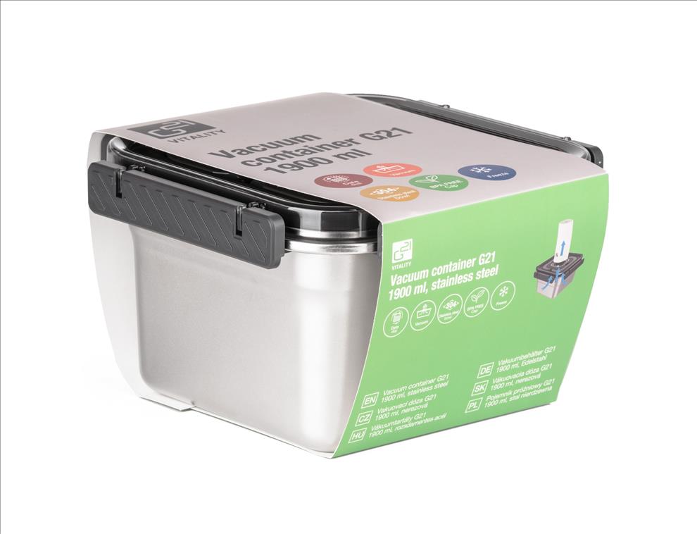 Bezpečné, odolné a hygienické skladování potravin. Nerezová vakuovací dóza G21 s objemem 1900 ml je ideální pro prodloužení čerstvosti potravin i praktické uskladnění v ledničce, mrazáku nebo pečení bez víka. Využijete ji každý den a pro každou situaci – doma i na cestách.