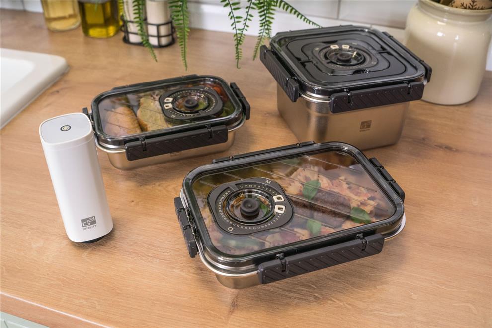 Víko z BPA Free plastu je vybavené vakuovacím ventilem a praktickým nastavitelným ukazatelem data. Budete tak vědět, kdy byly potraviny vakuovány nebo do kdy se mají spotřebovat. Pro uvolnění vakua a otevření dózy stačí jemně zmáčknout ventil uprostřed víka.