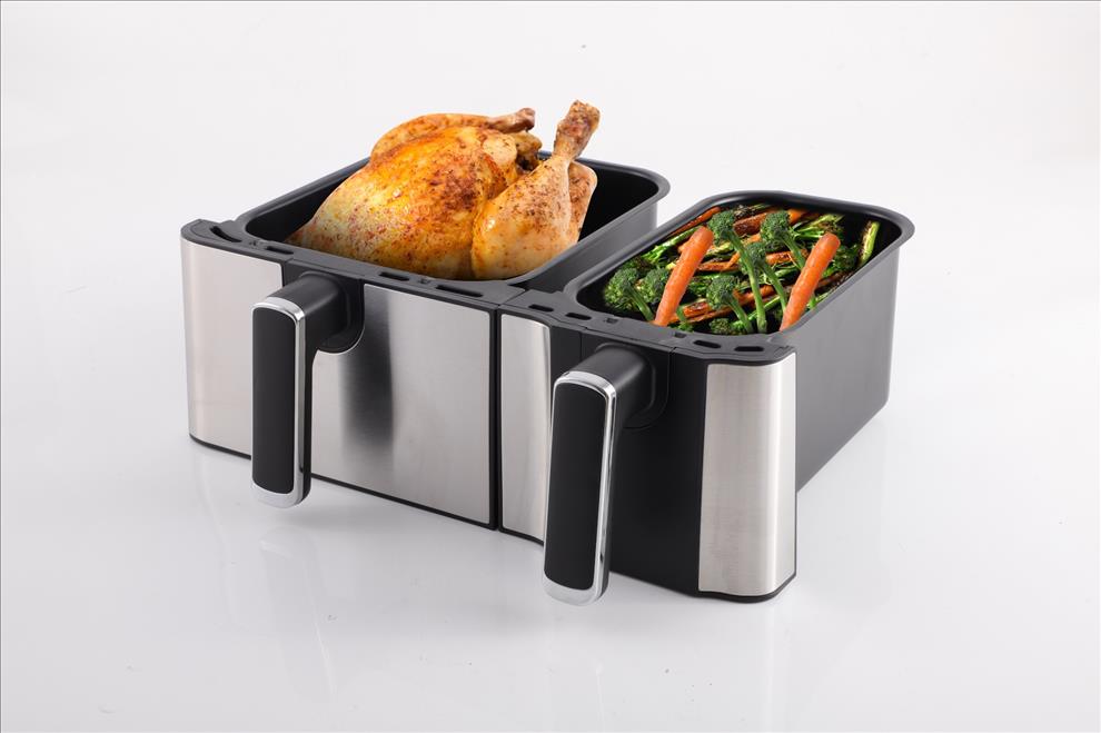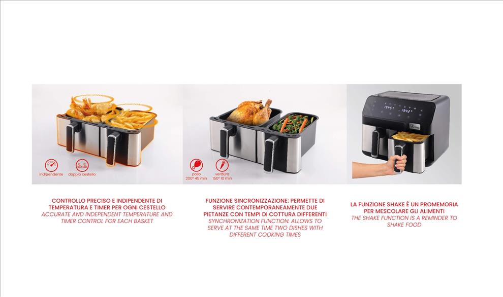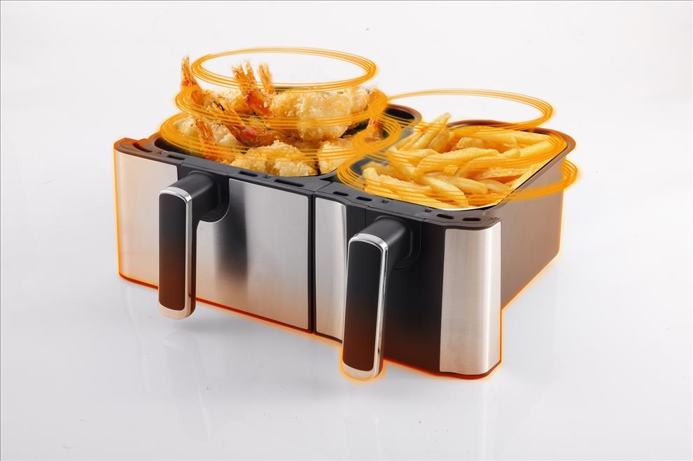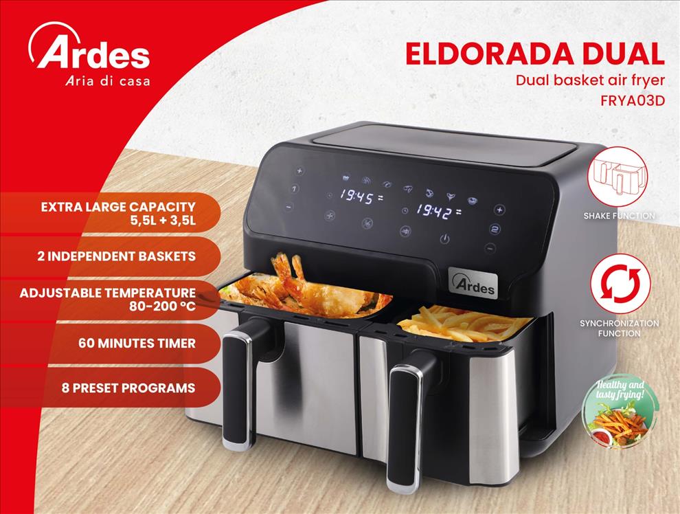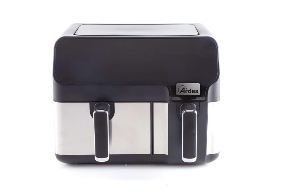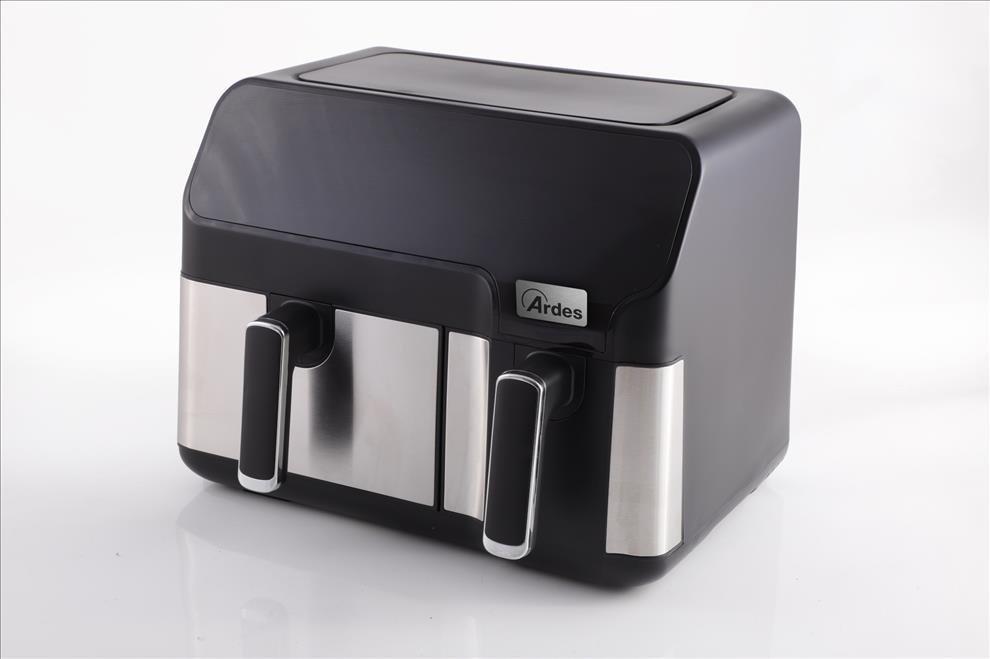 Ardes horkovzdušná fritéza s dvojitým košem, extra velkou kapacitou pro rodinu, kapacita 5,5l + 3,5l. Oba nepřilnavé koše umožňují přípravu různých jídel bez míchání chutí a vůní. Oba koše jsou vhodné do myčky. Nezávislé nastavení teploty a časovač pro každý koš. Zdravá alternativa k fritéze a troubě. Dokáže vařit rovnoměrně a rychle. Technologie Rapid Air: o 80 % méně tuku a minimální zápach v kuchyni.