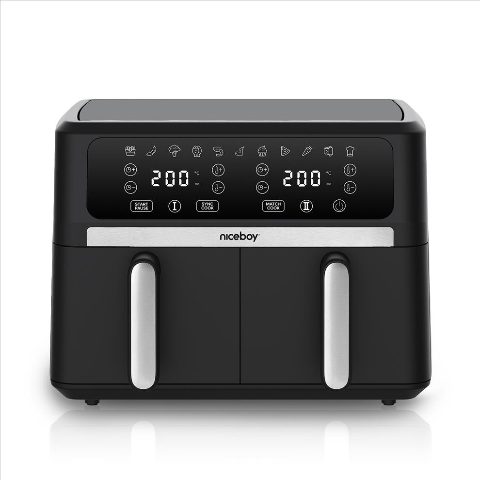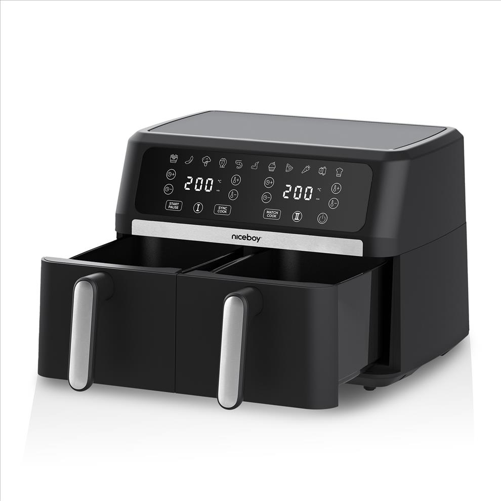 S horkovzdušnou fritézou Niceboy AirFryer DUO připravíš hlavní chod i přílohu najednou. Má totiž ne jeden, ale hned dva oddělené koše – každý o objemu 4,5 litru. Peč, griluj, smaž nebo jenom ohřívej. Ve 2,4kilowattové fritéze horký vzduch cirkuluje, takže oběd, snídani nebo večeři připravíš vždycky rovnoměrně. A navíc s minimem tuku! Rychlé a nutričně vyvážené jídlo už nebude jenom tvoje zbožné přání.
