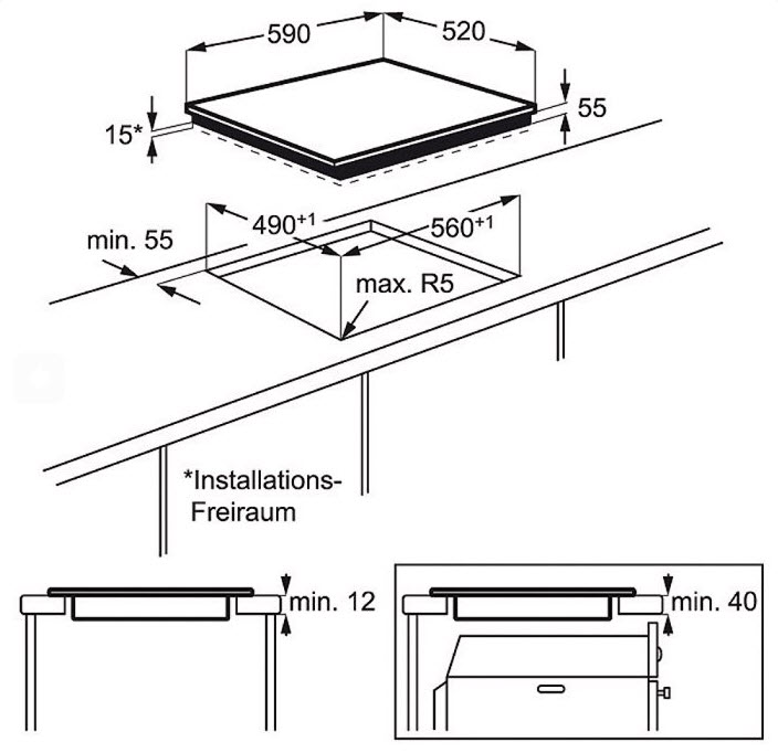 Rozměry pro vestavbu (v x š x h): 55 x 560 x 490 mm