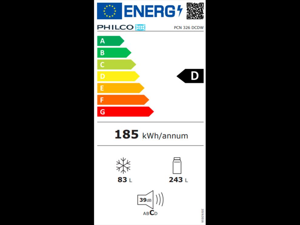 Kombinovaná chladnička. PHILCO PCN 326 DCDW. . Elektronické ovládání s vnitřním LED displejem. Posuvný ovladač nastavení výkonu mrazáku. SuperFreeze – rychlé zmrazení. LED osvětlení. Alarm otevřených dveří. . Energetická třída D. . Objem 326 l. Chladnička 243 l. Mraznička 83 l. . Roční spotřeba energie 185 kWh. Klimatická třída N, ST. Hlučnost 39 dB. Třída hlučnosti C. . Mrazící výkon 3,8 kg/24 hod.. Akumulační doba 9,5 hod. . Rozměry (v × š × h) 201 × 60 × 60,5 cm