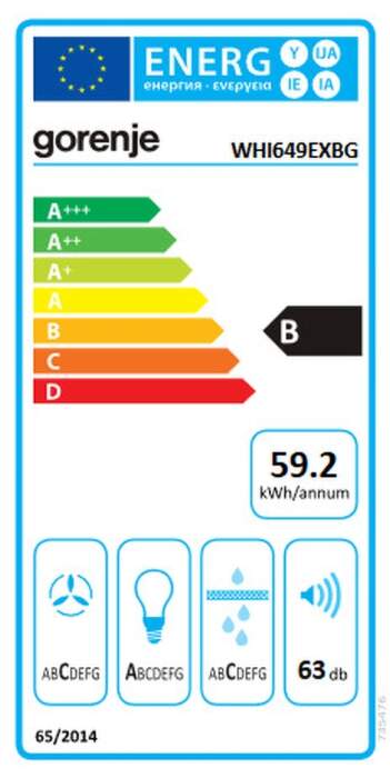 Komínový odsavač par Gorenje WHI649EXBG v černém provedení je zařazen do energetické třídy B. K dispozici má 3 výkonové stupně s maximálním výkonem odtahu 606 m3/hod. Jeho provoz je možný s odtahem do komína nebo s provozem recirkulace. Průměr odtahové roury je 150 mm. Pracovní plochu pod digestoří zpřehledňuje LED pásek. Odsavač Gorenje WHI649EXBG je vybaven omyvatelným hliníkovým filtrem s polyuretanovou pěnou, který zachytí vznikající mastnoty. Maximální hlučnost dosahuje 63 dB. Šířka 60 cm.
