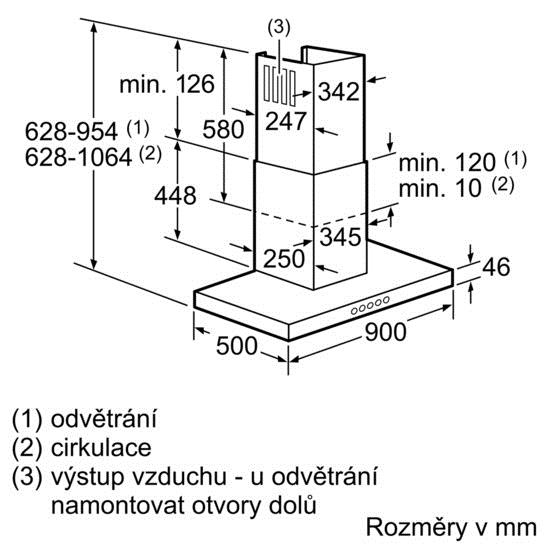 • rozměry spotřebiče pro cirkulaci (VxŠxH): 628-1064 x 900 x 500 mm