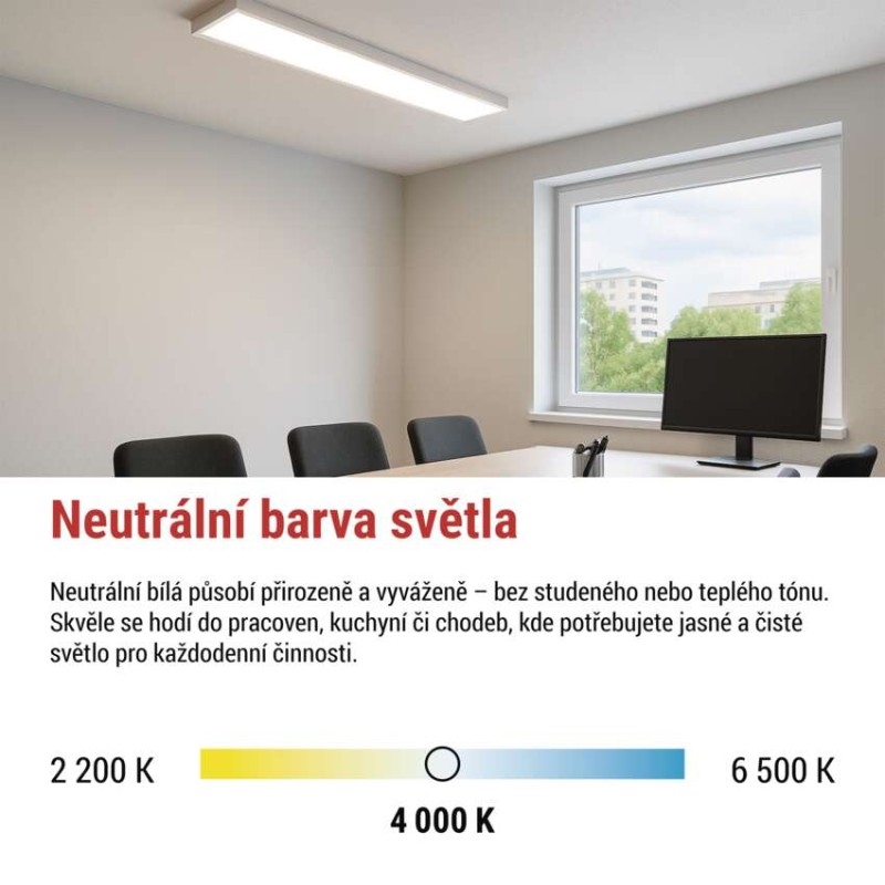 barva světla: neutrální bílá|barva těla: bílá|dálkový ovladač: ne|další funkce: –|do chodby a na schodiště: ano|do dílny a garáže: ne|do kanceláře: ano|do koupelny: ne|do kuchyně: ano|do obýváku, ložnice a dětského pokoje: ano|dosah senzoru: nemá senzor|flicker-free: ano|frekvence: 50/60 Hz|index podání barev (CRI): Ra > 80|jazyky aplikace: –|kategorie: PROFI|kompatibilita: –|krytí: IP20|materiál difuzoru: plast (PS)|materiál LGP: neuvádí se|materiál těla: ocelový plech|montážní otvor: neuvádí se|možnost stmívání: ne|náhrada za žárovku: 4× 18 W CFL|napětí: 220–240 V~|na zahradu a balkon: ne|notifikace do mobilní aplikace: ne|obsah balení: –|ovládání hlasovými asistenty: ne|podporované OS: –|pohybový senzor: ne|přenosová frekvence: –|příkon: 36 W|prodejní obal: 1 ks, krabice|protokol: –|proud: 170 mA|řada: BAXXO|rozměr: 1 200 × 300 × 50 mm|světelná účinnost: 120 lm/W|světelný tok: 4 320 lm|teplota chromatičnosti: 4 000 K|tvar: obdelník|typ difuzoru: mléčný|typ svítidla: panel|účiník: