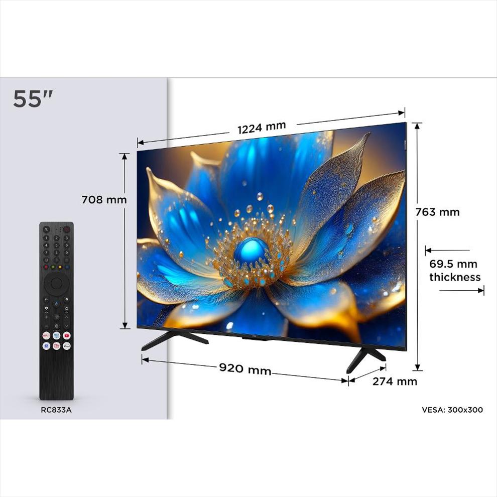 QLED televize, úhlopříčka 55"/139 cm, OS Google TV, 4K - UHD 3840 × 2160, obnovovací frekvence 60 Hz, DOLBY VISION, výkon reproduktorů 20 W, 2x USB, 3x HDMI, LAN, Wi-Fi, BT, Apple TV, Netflix, Disney+