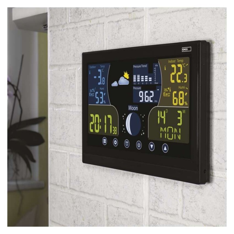 Bezdrátová meteostanice značky EMOS pro domácí použití má LED podsvícený displej, dá se pověsit na zeď a dosah jejího čidla je až 100 metrů. Stanice měří vnitřní i venkovní teplotu, vnitřní i venkovní vlhkost, její součástí je i barometr, ukáže vám také fáze měsíce nebo korekci nadmořské výšky. Díky této moderní meteostanici budete mít dokonalý přehled o počasí.