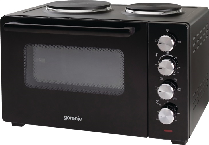 Minitrouba Gorenje OM30GBX, 1600W příkon trouby, 1600W příkon vrchních varných zón, kapacita trouby 30l, nastavitelný teplotní rozsah trouby od 100 °C - 220 °C, 3 úrovně pečení, dvojvrstvé skleněné dveře, 5 programů pečení, příslušenství (pečící plech, otočný rošt, oboustranná mřížka)