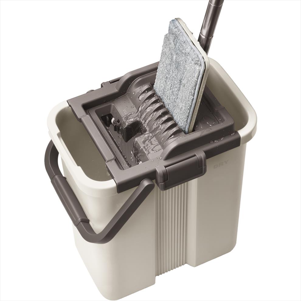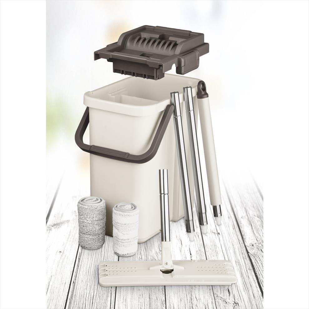 Úklidová sada dvoudílného vědra a plochého mopu určená k čištění podlahových interiérů.