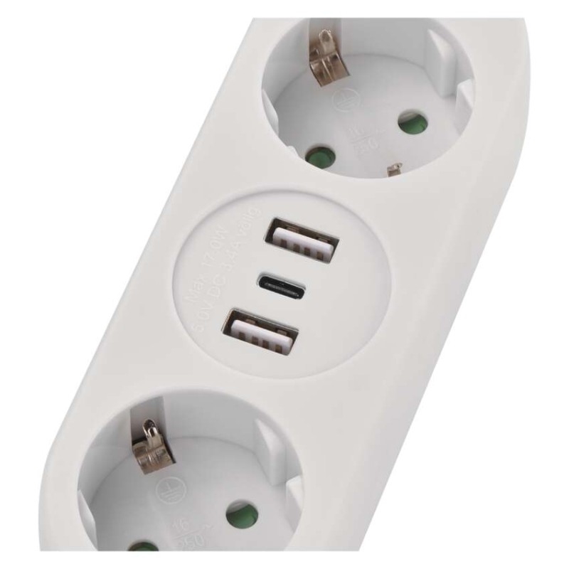 Prodlužovací přívod. 250V~/16A max. 2 zásuvky s dětskými clonkami. 2× USB-A + 1× USB-C ; 5 V DC; total ? 3,4 A (17 W) max. Délka přívodního kabelu 1,5 m. Vodič H05VV-F3G 1,5 mm2.