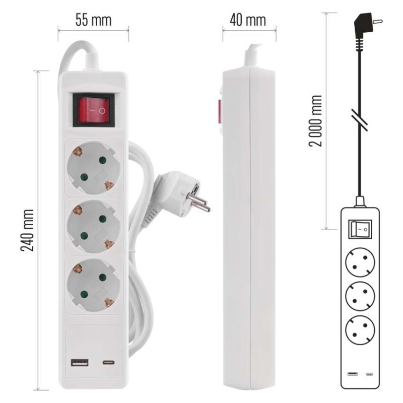 Prodlužovací přívod s vypínačem. 250V~/16A max. 3 zásuvky s dětskými clonkami - SCHUKO systém. USB A+C 3,4 A, 17 W max. Délka přívodního kabelu 2 m. Vodič H05VV-F3G 1,5mm2.