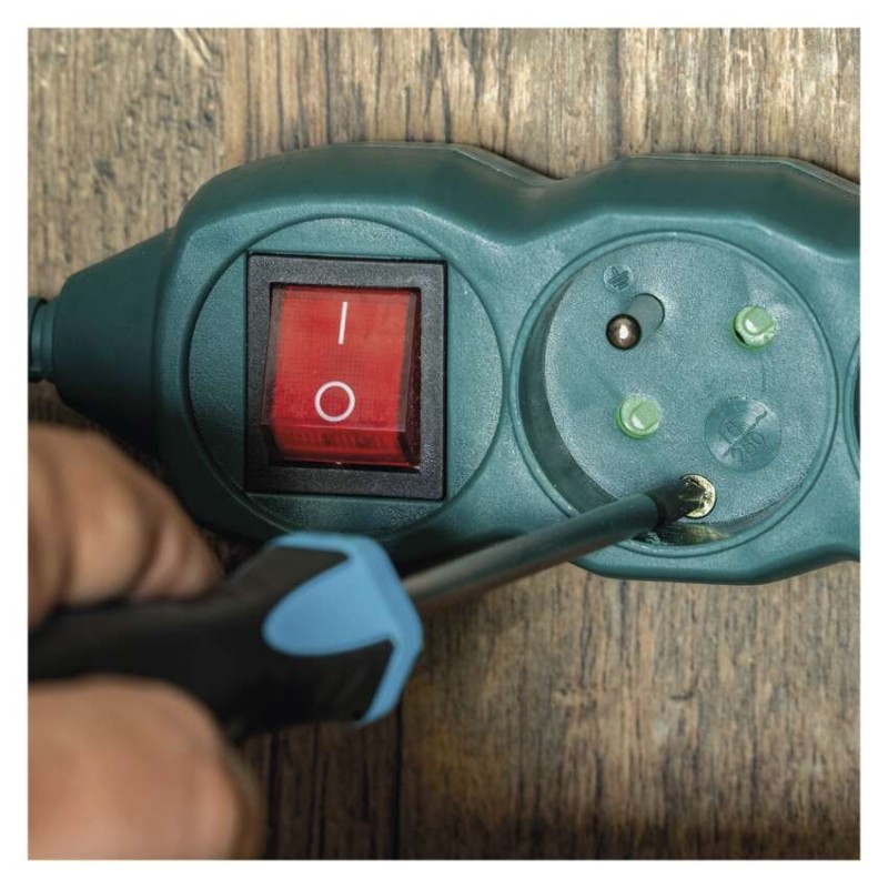 Zelený prodlužovací přívod, 3 zásuvka s vypínačem, délkou 2 m a průřezem vodiče 1 mm2. Vhodný pro maximální zátěž 16 A max. Montážní otvory pro přichycení zásuvky na zeď.