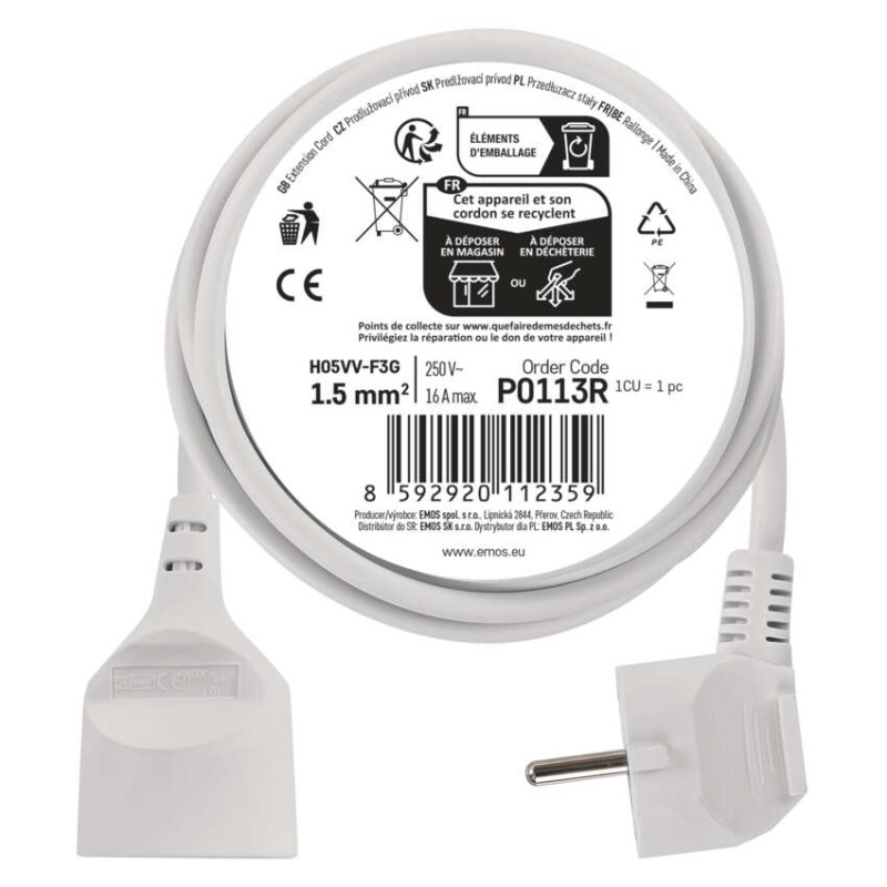 Bílý prodlužovací přívod s jednou zásuvkou - spojka, délkou 3 m a průřezem vodiče 1,5 mm2. Vhodný pro maximální zátěž 16 A max.