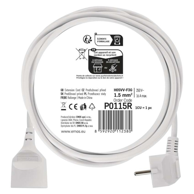 barva: bílá|délka: 5 m|dětské clonky: ano|krytí: IP20|materiál zásuvky a vidlice: plast|max. zátěž: 3 680 W|napětí: 250 V~|počet zásuvek: 1|prodejní obal: 1 ks, závěs|proud: 16 A max.|průřez vodiče: 1,5 mm2|typ izolace: PVC|USB výstup: ne|vodič: H05VV-F3G|vypínač: ne