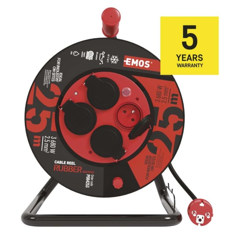 Běžné prodlužovací kabely na bubnu mají průřez vodiče 1,5mm2 či nižší a izolaci z PVC, což omezuje rozsah použití. Na rozdíl od běžné produkce se tento produkt firmy EMOS liší jak větším průřezem vodiče, který umožňuje bezproblémový provoz i s výkonově náročnějšími zařízeními jako jsou např. svářečky, stavební vrátky, kompresory atp., tak především díky použití kvalitní gumy jako izolace a následně ještě svrchní vrstvy z chloroprenu zaručuje vysokou mechanickou odolnost, ohebnost kabelu a bezproblémovou funkčnost v širokém spektru vnějších teplot.