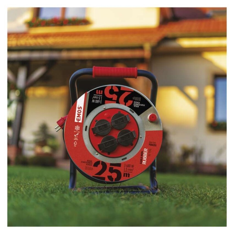 Prodlužovací kabel v domácnostech, dílnách, lehkých provozech umožňuje zapojení až čtyř elektrických zařízení současně. Snadné navíjení kabelu zajišťuje vodící oko a robustní kovové tělo navijáku. Pryžové kabely H05RR-F jsou určeny pro střední mechanická namáhání v prostředí obyčejném, studeném i horkém, vlhkém i mokrém. Kabel s průřezem vodiče 1,5 mm2 odolá vodě, vlhku, studeným i horkým teplotám od -25 °C do +60 °C a nabízí tak mnohostranné využití. Pokud hledáte spolehlivého parťáka, který vám vydrží mnoho let, vsaďte na kvalitní navíjecí buben EMOS nabízený s prodlouženou tříletou zárukou.