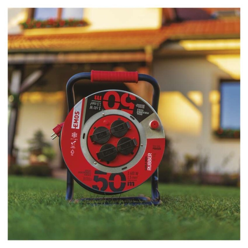 Prodlužovací kabel v domácnostech, dílnách, lehkých provozech umožňuje zapojení až čtyř elektrických zařízení současně. Snadné navíjení kabelu zajišťuje vodící oko a robustní kovové tělo navijáku. Pryžové kabely H05RR-F jsou určeny pro střední mechanická namáhání v prostředí obyčejném, studeném i horkém, vlhkém i mokrém. Kabel s průřezem vodiče 1,5 mm2 odolá vodě, vlhku, studeným i horkým teplotám od -25 °C do +60 °C a nabízí tak mnohostranné využití. Pokud hledáte spolehlivého parťáka, který vám vydrží mnoho let, vsaďte na kvalitní navíjecí buben EMOS nabízený s prodlouženou tříletou zárukou.