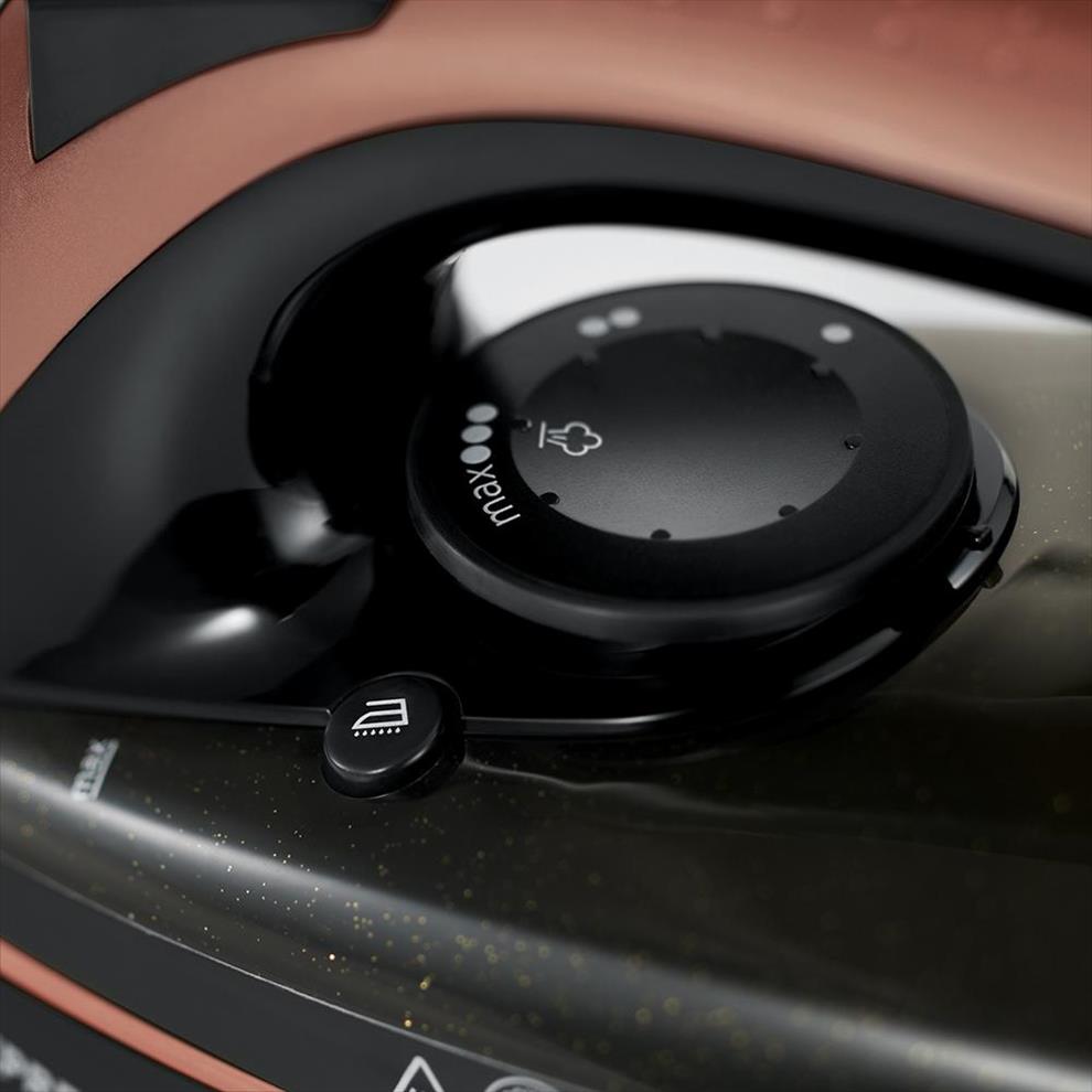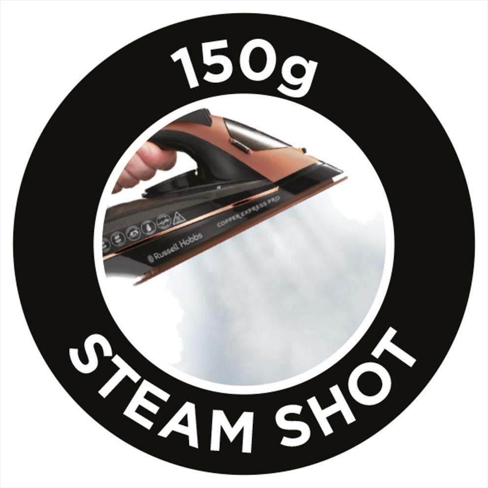Žehlička napařovací. RUSSELL HOBBS 23986-56. . Keramická žehlicí plocha s měděným povrchem. Parní ráz: 150 g/min. Nepřetržitý výstup páry: 40 g/min. Kapacita nádržky na vodu: 315 ml. Variabilní nastavení teploty. . Variabilní regulace páry. Vertikální napařování. Funkce proti odkapávání. Funkce odvápnění a samočištění. Funkce samočištění. . Automatické vypnutí. Kontrolka zapnutí a kontrolka teploty. Texturovaná rukojeť pro pohodlné uchopení. 2m kabel. Příkon 2600 W. Barva černá/hnědá