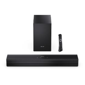 Kompaktní 2.1 soundbar ideální pro menší obytné prostory s bezdrátovým subwooferem pro zvukový zážitek jako v kině. Připojení HDMI (ARC/CEC) nabízí jednoduché nastavení a ovládání soundbaru pomocí dálkového ovladače televizoru.