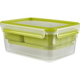 Box na potraviny. Tefal Masterseal To Go N1071610 2,3 l. . Obdélníková dóza s objemem 2,3 l. Systém uzavírání se 4 klipy po stranách. Součástí 3 misky co se vejdou dovnitř. Udržuje jídlo déle čerstvé díky těsnění. V zelené barvě