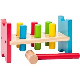Zatloukačka. WOODY Zatloukačka. . Kolíky zatloukačky je třeba správně nasadit a poté zatlouci dřevěnou paličkou. Když je zatlučeno, obraťte zatloukačku na druhou stranu a dítě může ve své činnosti pokračovat. Hračka je vhodná pro rozvoj jemné i hrubé motoriky dítěte. . Věk 2+. Rozměry (VxŠxH) 12 x 21,5 x 9 cm