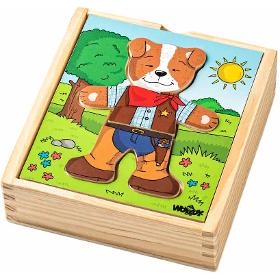 Puzzle. WOODY Puzzle Převlékání pejska. . Děti zde mají možnost si dle vlastní fantazie oblékat a měnit postavičku pejska. Mají k dispozici obličeje znázorňující různé nálady, tělíčka a nožičky pejska s různými outfity. Rozvijí fantazii a schopnost logického myšlení. Baleno v praktické dřevěné krabičce. . 18 dílků. . Věk 1+. Rozměry (VxŠxH) 4 x 13 x 14 cm