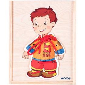 Provlékání provázku. WOODY Šněrovací šatní skříň Kluk. . Děti dle vlastní fantazie oblékají postavičku chlapečka. K dispozici mají několik variant oblečení. Chlapec namalovaný na vysouvacím víku krabičky má na těle otvory, které umožňují přichycení oblečků tkaničkami. . Design české výtvarnice. Součástí balení jsou 4 barevné tkaničky. Tato hračka rozvíjí jemnou motoriku, logiku a fantazii. . Věk 3+. Rozměry (VxŠxH) 2,5 x 18,5 x 23 cm