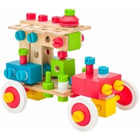 Stavebnice. WOODY Stavebnice v kyblíku. . Stavebnice obsahuje kvalitně opracované díly. Montážní kostky a spojky jsou vyrobeny ze dřeva. Šrouby a matice z kvalitního pevného plastu. Kolečka z pevné gumy. . Stavebnice poskytuje dětem možnost poskládat a smontovat různé modely aut a dalších fantastických strojů. Vše pak mohou poskládat zpět do praktického papírového kyblíku. Součástí balení je i dřevěný šroubovák. . 140 dílků. . Věk 3+. Rozměr 27 x 17,5 cm