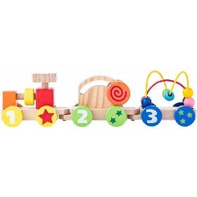 Vláček pro nejmenší. WOODY Skládací vláček se šroubem. . Vláček pro nejmenší nabízí dětem hned několik prvků k procvičení jemné motoriky. Šroub na lokomotivě, korálky na drátěné konstrukci a pohyblivé kolečko. . Věk 11+. Rozměr 9,5 x 32,5 cm