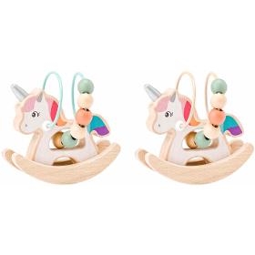 Jednorožec. WOODY Jednorožec s labyrintem. . Po drátech motorického labyrintu provléká dítě korálky. Tím procvičuje jemnou motoriku. Tato populární motorická hračka má podobu jednorožce. . Dvě barevné varianty. . Věk 1+. Rozměr (VxŠxH) 12,4 x 10,7 x 8,2 cm