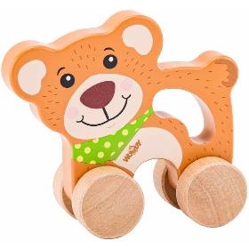 Medvěd. WOODY Medvěd na kolečkách. . Dřevěná hračka na kolečkách s držadlem. Její tvar umožňuje dětské ruce pohodlný a pevný úchop. Design české návrhářky. . Věk 1+. Rozměry (VxŠxH) 12 x 13 x 5 cm
