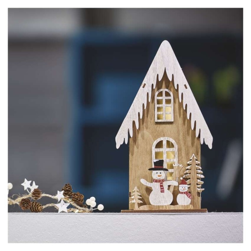 Dřevěné dekorace navozují atmosféru tradičních Vánoc charakteristických vůní perníčků, zvukem vánočních koled a nezaměnitelnou chutí bramborového salátu. Dřevěná dekorace "domek se sněhuláky" je vybavena příjemným teple bílým osvětlením. Díky napájení pomocí AA baterií ji můžete umístit na libovolné místo ve vašem interiéru a skvěle se bude vyjímat zejména na okenním parapetu, komodě či televizním stolku.