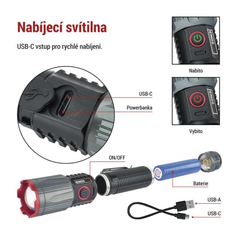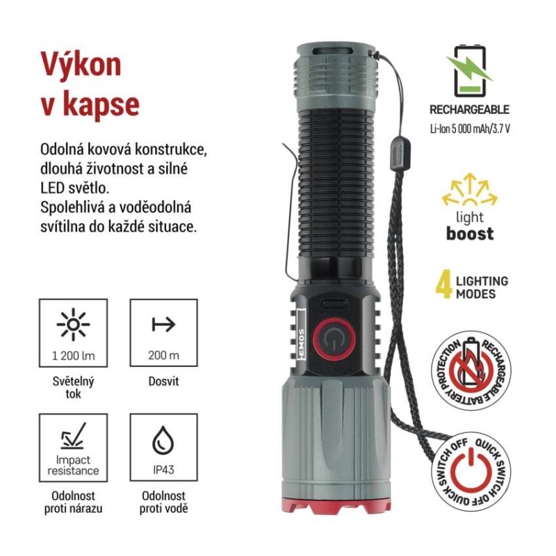 barva: černá, metalická šedá|baterie součástí balení: ano|doba nabíjení: 4,5 h|doba svícení: 4–22 h|doba svícení detail: LED BOOST – 1 min, LED 100 % – 4 h, LED 50 % – 8 h, LED 10 % – 22 h|dosvit: LED BOOST – 200 m, LED 100 % – 140 m, LED 50 % – 100 m, LED 10 % – 50 m|fokus: ano|hmotnost: 168 g|LED indikace nabíjení: ano|LED indikace stavu akumulátoru: ano|materiál: hliník|maximální dosvit: 200 m|maximální světelný tok: 1 200 lm|nabíjecí: ano|napájení: Li-Ion 18650|nárazuvzdornost: ano|počet režimů svícení: 4|příslušenství: neuvádí se|prodejní obal: 1 ks, krabice|režimy svícení: LED BOOST, LED 100 %, LED 50 %, LED 10 %|rozměr: 150 × 35 × 35 mm|speciální funkce: funkce rychlého vypnutí, funkce ochrany baterie, funkce powerbank|světelný tok: LED BOOST – 1 200 lm, LED 100 % – 550 lm, LED 50 % – 300 lm, LED 10 % – 60 lm|typ baterie: 2 200 mAh/3,7 V|typ napájecího konektoru: USB-C|voděodolnost: ano (IP43)|vybavení: klip, magnet, poutko|záruční doba: 2 roky|zdroj světla: LED|značka: EMOS