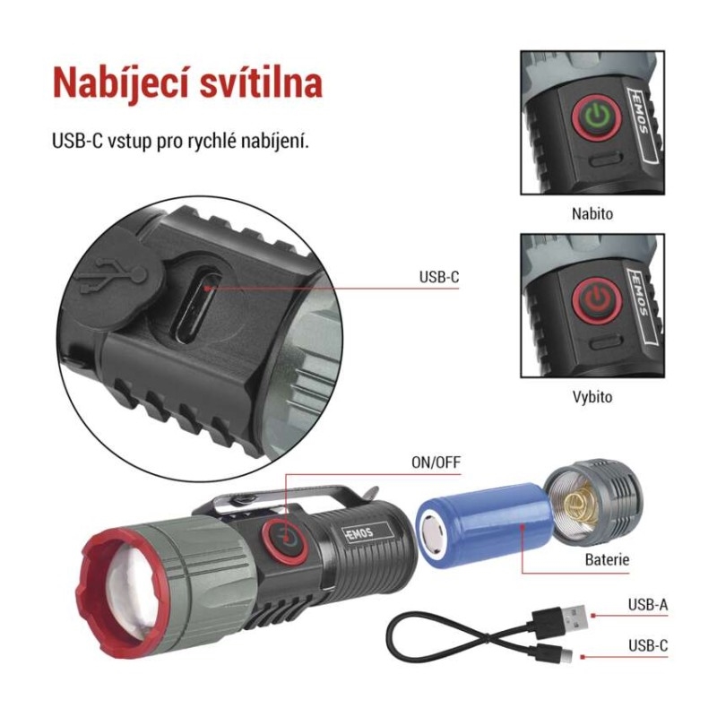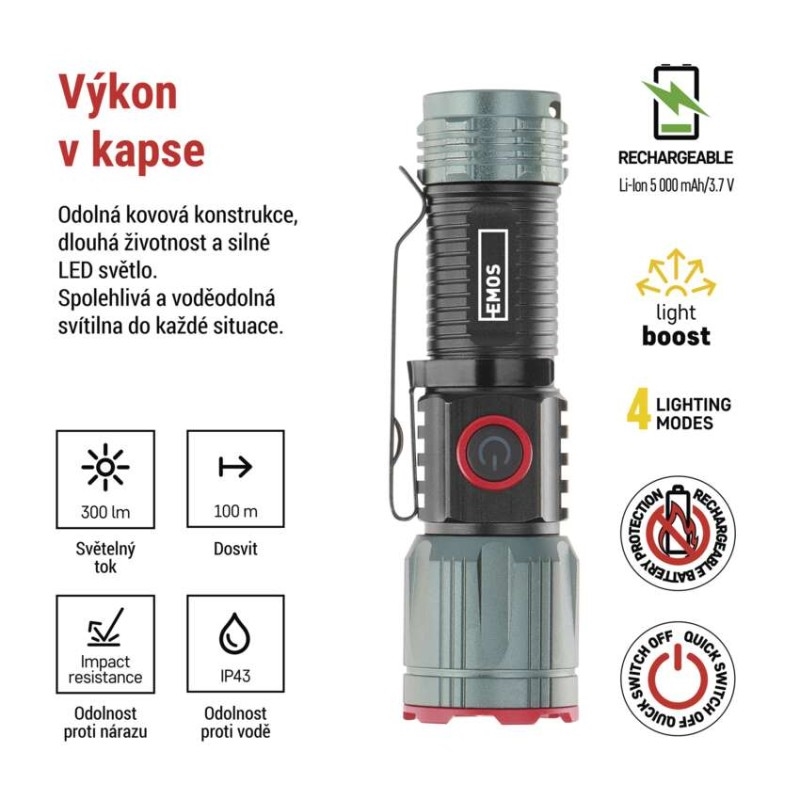 barva: černá, metalická šedá|baterie součástí balení: ano|doba nabíjení: 2,5 h|doba svícení: 3–18 h|doba svícení detail: LED BOOST – 1 min, LED 100 % – 3 h, LED 50 % – 3,5 h, LED 10 % – 18 h|dosvit: LED BOOST – 100 m, LED 100 % – 80 m, LED 50 % – 60 m, LED 10 % – 30 m|fokus: ano|hmotnost: 63 g|LED indikace nabíjení: ano|LED indikace stavu akumulátoru: ano|materiál: hliník|maximální dosvit: 100 m|maximální světelný tok: 300 lm|nabíjecí: ano|napájení: Li-Ion 16340|nárazuvzdornost: ano|počet režimů svícení: 4|příslušenství: neuvádí se|prodejní obal: 1 ks, krabice|režimy svícení: LED BOOST, LED 100 %, LED 50 %, LED 10 %|rozměr: 90 × 25 × 25 mm|speciální funkce: funkce rychlého vypnutí, funkce ochrany baterie|světelný tok: LED BOOST – 300 lm, LED 100 % – 160 lm, LED 50 % – 100 lm, LED 10 % – 15 lm|typ baterie: 700 mAh/3,7 V|typ napájecího konektoru: USB-C|voděodolnost: ano (IP43)|vybavení: klip, magnet, poutko|záruční doba: 2 roky|zdroj světla: LED|značka: EMOS