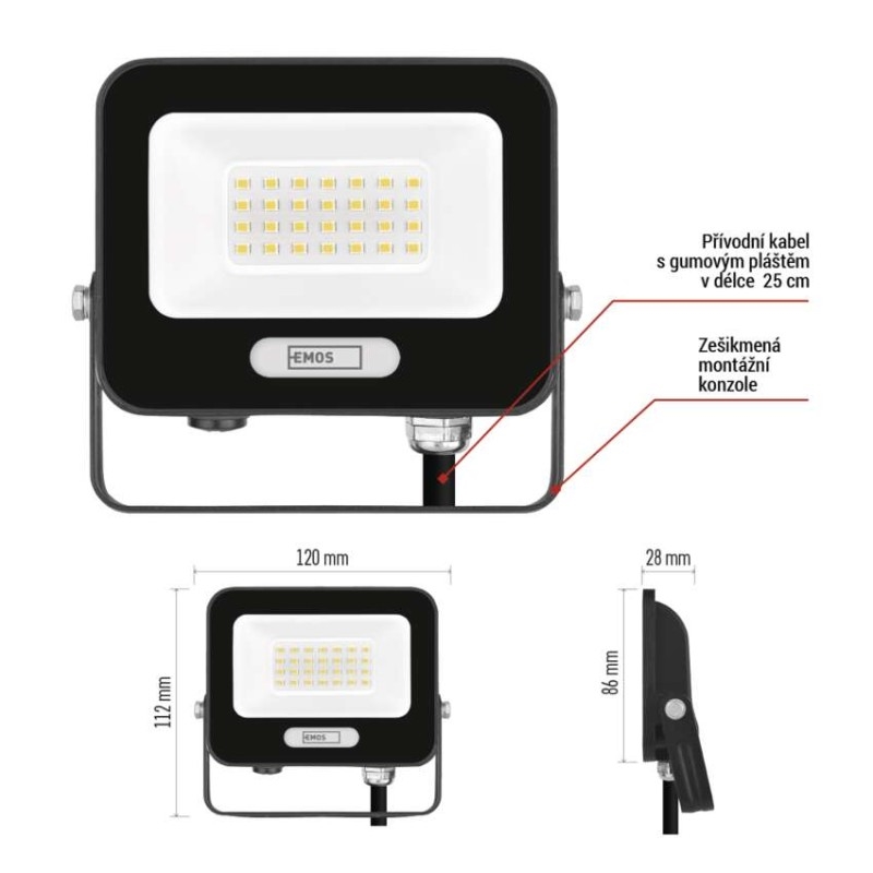 EMOS LED reflektor GLARO 20W, černý, IP65, 2000 lm, neutrální bílá